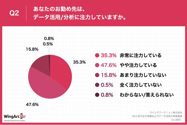 Q1で「まったく行っていない」「あてはまるものはない」「わからない/答えられない」と回答した方以外に、「Q2.あなたのお勤め先は、データ活用/分析に注力していますか。」(n=366)と質問したところ、「非常に注力している」が35.2%、「やや注力している」が47.5%という回答となりました。