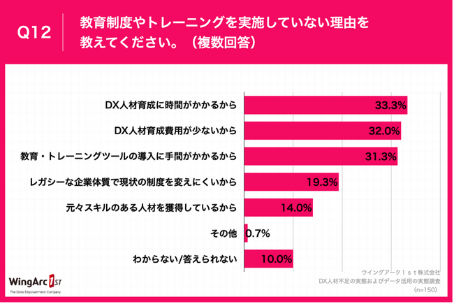 Q10で「実施していない」と回答した方に、「Q23.教育制度やトレーニングを実施していない理由を教えてください。(複数回答)」(n=150)と質問したところ、「DX人材育成に時間がかかるから」が33.3%、「DX人材育成費用が少ないから」が32.0%、「教育・トレーニングツールの導入に手間がかかるから」が31.3%という回答となりました。