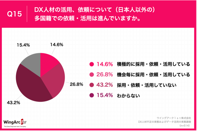 「Q15.DX人材の活用、依頼について(日本人以外の)多国籍での依頼・活用は進んでいますか。」(n=514)と質問したところ、「積極的に採用・依頼・活用している」が14.6%、「機会毎に採用・依頼・活用している」が26.8%という回答となりました。