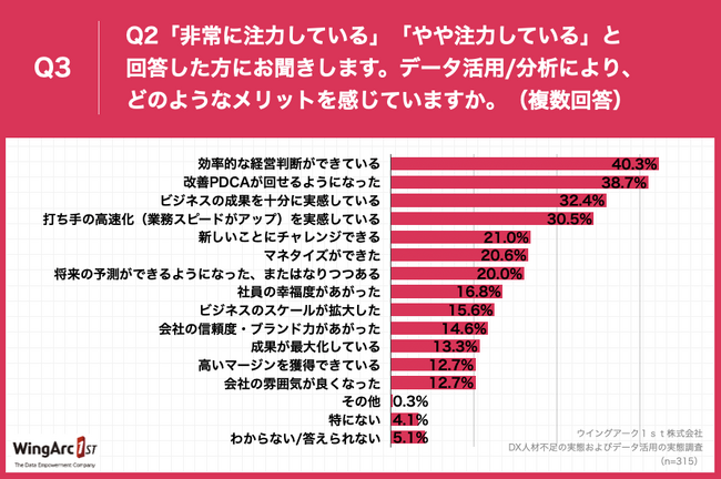 Q2で「非常に注力している」「やや注力している」と回答した方に、「Q3.データ活用/分析により、どのようなメリットを感じていますか。(複数回答)」(n=303)と質問したところ、「効率的な経営判断ができている」が49.5%、「改善PDCAが回せるようになった」が45.5%、「ビジネスの成果を十分に実感している」が39.3%という回答となりました。