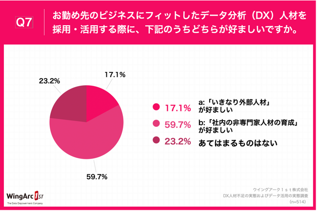 「Q7.お勤め先のビジネスにフィットしたデータ分析(DX)人材を採用・活用する際に、下記のうちどちらが好ましいですか。」(n=514)と質問したところ、「a:「いきなり外部人材(優秀な外部人材を採用・活用)」が好ましい」が17.1%、「b:「社内の非専門家人材の育成(ビジネスマインドを持った現場出身社員の育成)」がいい」が59.7%という回答となりました。