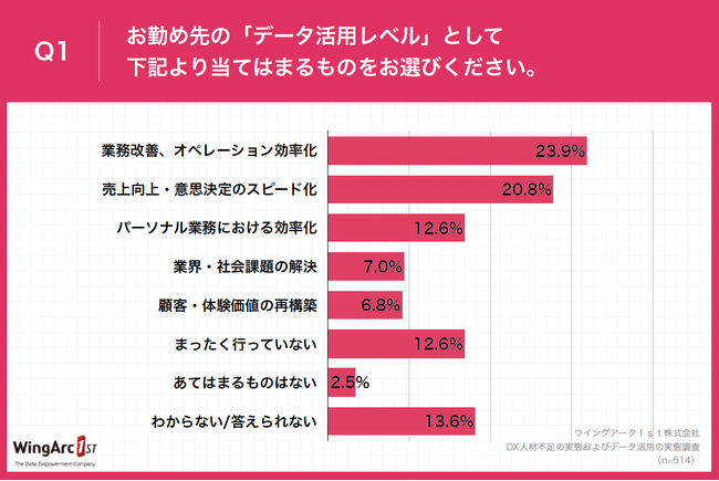 「Q1.お勤め先の「データ活用レベル」として下記より当てはまるものをお選びください。」(n=514)と質問したところ、「業務改善、オペレーション効率化(チーム、部門単位など局所的にデータ活用の仕組みが用意されている)」が23.9%、「売上向上・意思決定のスピード化(組織横断/全社共通のデータ活用システムが整備されている)」が20.8%という回答となりました。