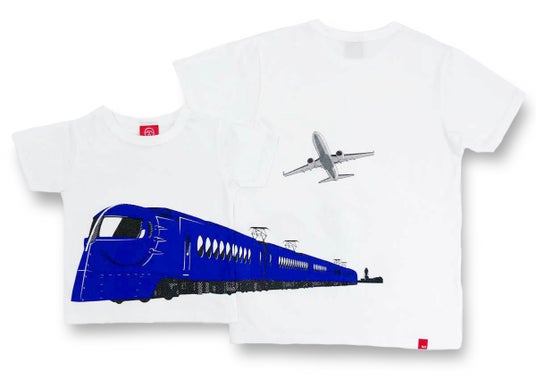 特徴的な形状と鮮やかなカラーで空港特急として圧倒的な存在感を誇るラピートの車両をTシャツのフロントからバックにかけて大胆に描いた一枚。空港の管制塔のシルエットに加え飛行機が飛び立つ背景のデザインもラピートを引き立てます。
