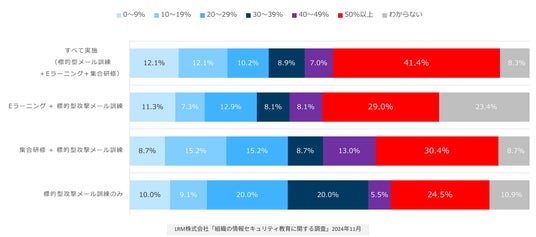 標的型攻撃メール訓練における教育内容別の報告率を見ると、「すべて実施」*した組織が最も高い不審メール報告率50%以上(41.4%)を記録しています。
