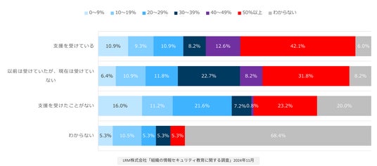 外部パートナーによる支援を受けている組織では、不審メール報告率50%以上の達成割合が高く42.1%を記録している一方で、支援を受けていない組織では不審メール報告率が23.2%と低くなる傾向が見られました。