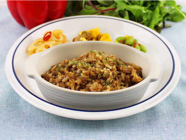 トマトと香味野菜がコクを引き立てるスパイシーなカレーソースを使用したキーマカレーリゾットです。牛ひき肉の旨味が食欲をそそります。玉ねぎを混ぜ込んだガーリックライスとご一緒によく混ぜてお召し上がりください。副菜は唐辛子がピリッと感じるレンコンの唐辛子ガーリック、マッシュルームと卵の青のりあえ、枝豆の玉ねぎドレッシングです。