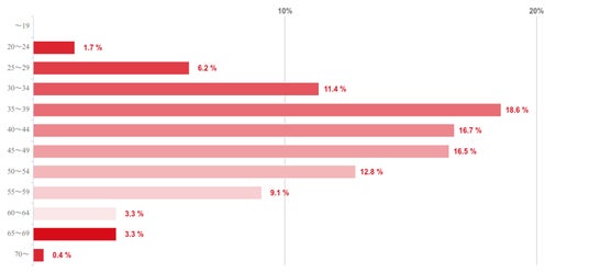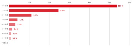 18~24歳が53.7%で圧倒的に多く、25~29歳が24.6%、30~34歳が11.2%など、年齢順に続く結果となった。