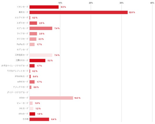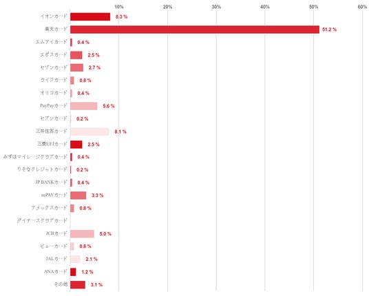 楽天カードが49.4%で圧倒的に多く、これに続いたイオンカードと三井住友カード8.1%だった。また、PayPayカードやJCBカードも一定数の回答があった。