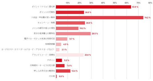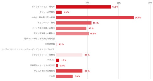 「ポイント(マイル)還元率」が24.8%で最も多かったが、「入会金・年会費が安い/無料」も17.6%でこれにせまる結果となった。また、「キャンペーン・特典」が11.4%でこれに続いた。