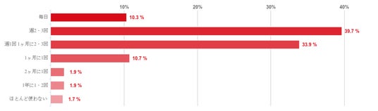 最も多かったのは「週2・3回」(39.7%)で、次に「週1回/1ヶ月に2・3回」との回答(33.9%)が多かった。また、毎日利用する人も10.3%いることがわかった