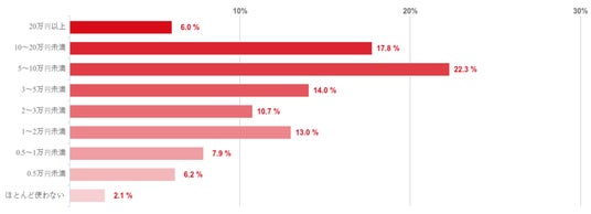 「5~10万円未満」利用する人が22.3%で最も多く、「10~20万円未満」が17.8%でこれに続いた。また、「3~5万円未満」(14%)、「1~2万円未満」(13%)との回答も多かった。