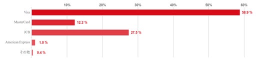 Visaが58.9%で最も多く、JCBが27.5%、Mastercardが12.2%で続いた。American Expressは全体の1%に留まった。