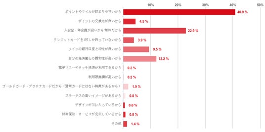 「ポイントやマイルが貯まりやすいから」が40.9%で最も多く、約4割を占めた。その他、「入会金・年会費が安いから/無料だから」「自分の経済圏との親和性が高いから」などの回答も多かった。