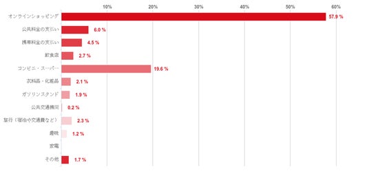 オンラインショッピングが57.9%で圧倒的に多く、コンビニ・スーパー(19.6%)がこれに続いた。また、公共料金や携帯料金の支払いに利用するとの回答も多かった。