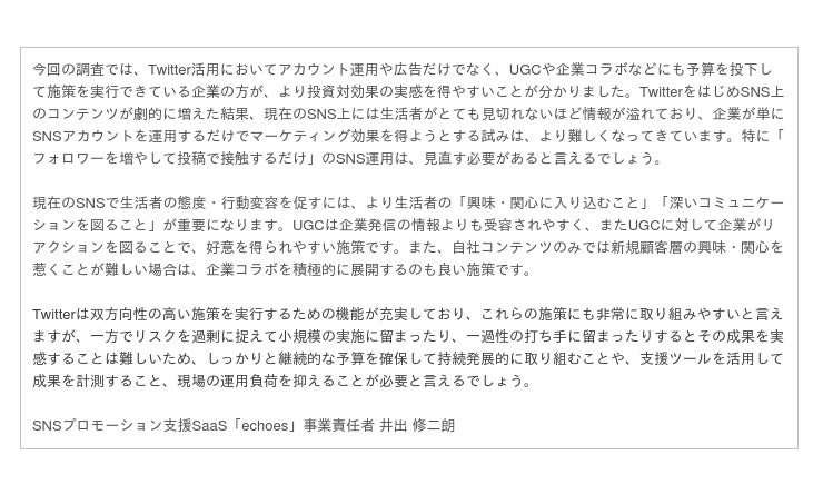 Twitterを活用する企業は、アカウント運用や広告出稿に加えて、企業間コラボやUGC生成・活用、ライブ配信などにも予算を投下しながら、より購買や来店につながりやすい施策設計を行うことで、さらにその成果が高まると考えられます。