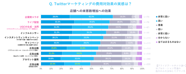 「予算をかけている施策別の費用対効果の実感」について分析したところ、企業間コラボやライブ配信、UGC生成・活用に取り組んでいる企業が、Twitterマーケティングの費用対効果の高さを実感する傾向にある結果となりました。店舗への来客数増加への効果を例にとると、これらの施策に取り組む企業は66%以上が費用対効果の実感を「非常に高い」「高い」と回答しています。