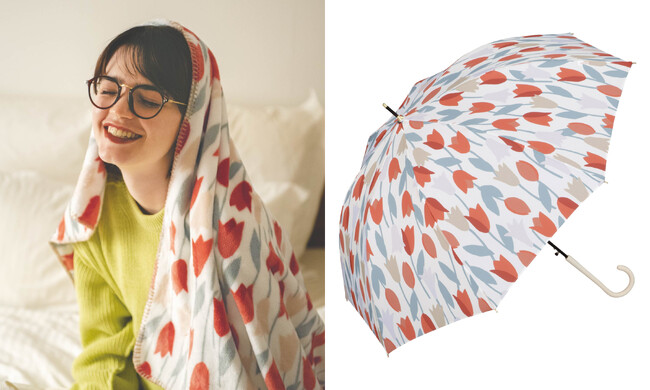 手触りの良いクッションブランケットには新デザイン「ブルーミングチューリップレッド」が仲間入り。同じデザインの傘と一緒に、ちょっとしたギフトとしても喜ばれるアイテムです。
