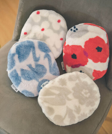 本体カバー裏側のポケット部分からシリカゲルビーズ入りの袋を取り出し、電子レンジで温めて使用する「エコウォーマー」。繰り返し使えるエコなあったかグッズです。