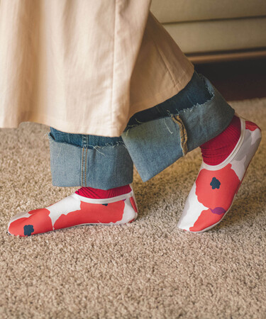 中生地はぽかぽかのボア素材になっており、寒い日でも温かく過ごせる「ぽかフィットルームシューズ」。足にフィットするので脱げにくく、底面には滑り止めが付いているので階段でも安心です。