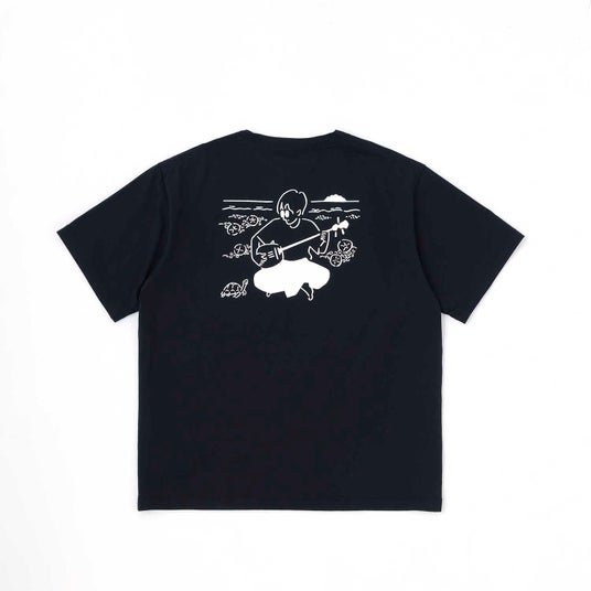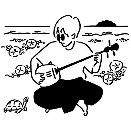 「CHILL」浜辺で三線を弾く島の若者とセマルハコガメ。
