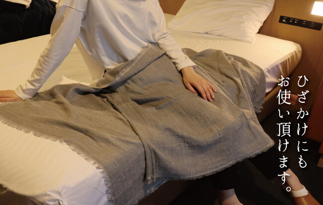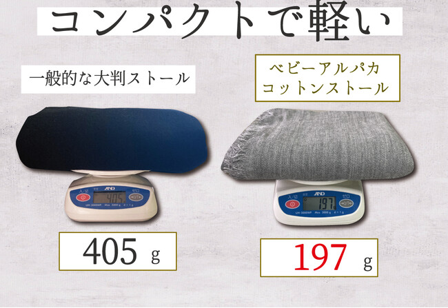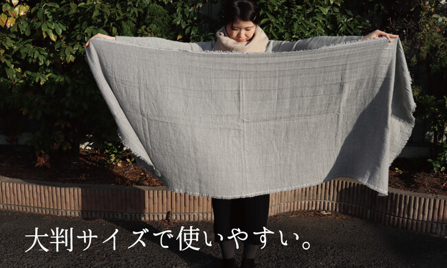 ふわっと空気を含むので一般的な大判ストールと比べてもとっても軽く、持ち運びにも便利で首元を優しく包み込みます。※当社比較