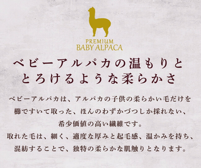 ・タイトル:「陽だまりの暖かさ」柔らかく、程よく暖かい。ベビーアルパカ×コットンストール