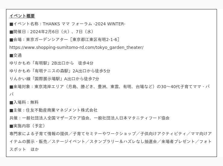 昨年より、同じく上記のような社会課題と向き合う、「一般社団法人全国マザーズケア協会」と「一般社団法人日本マタニティフード協会」を運営パートナーに迎え、施設運営の中で出産や育児を支える活動を一層強化して参りましたが、今般、より多くのママをサポートし、繋がりの輪を広げるため、「THANKS ママ フォーラム -2024 WINTER-」を開催することといたしました。