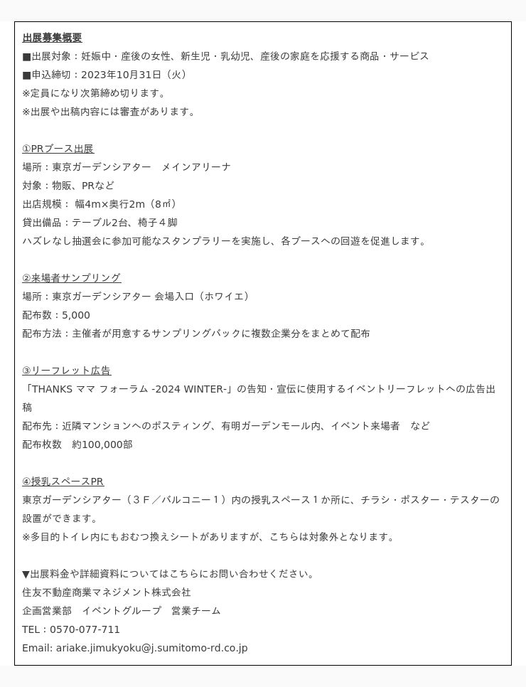 住友不動産商業マネジメント株式会社(本社:東京都新宿区 取締役社長:山本 直人)が、運営する複合商業施設「住友不動産 ショッピングシティ 有明ガーデン」(所在:東京都江東区)において実施するイベント「THANKS ママ フォーラム -2024 WINTER-」の出展者募集についてお知らせいたします。