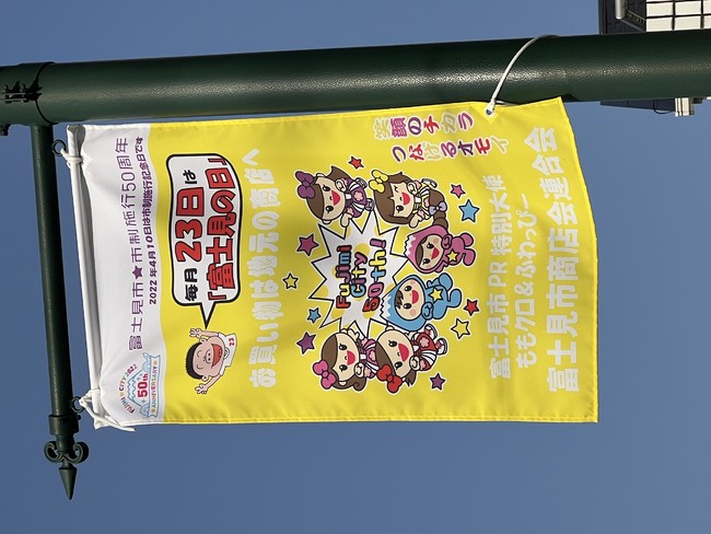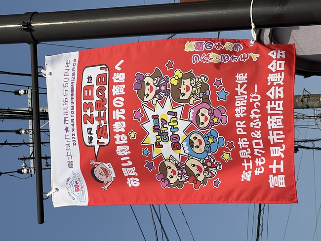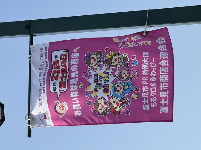 富士見市商店会連合会が、商店街のPRのため、ももクロや富士見市マスコットキャラクター「ふわっぴー」のイラストなどが入った商店街フラッグを掲出しています。