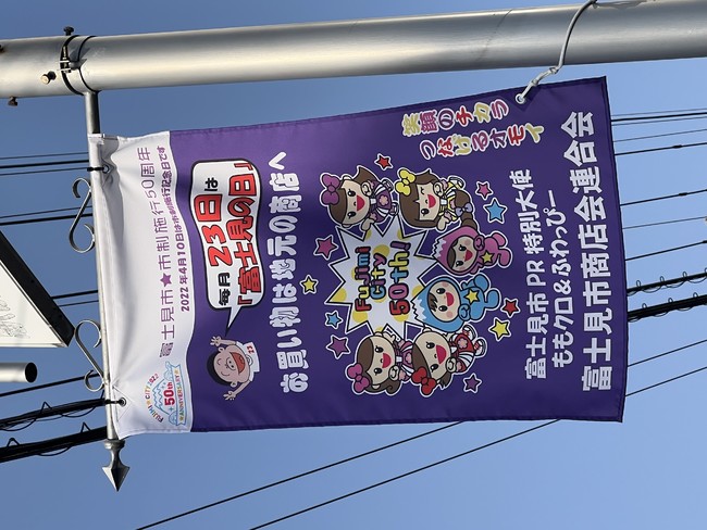 毎年、ももクロとコラボした新たなデザインを掲出しており、今年は市制施行50周年をPRするデザインとなっています。