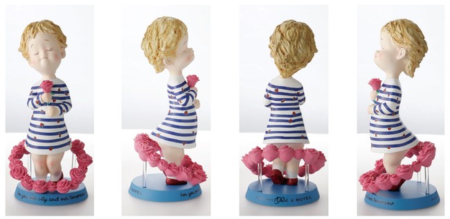 ローズちゃんを囲む19輪のバラの花は190年を意味し、ローズちゃんが手に持つ1輪のバラは200年への希望を込めています。衣装デザインは、「MUVEIL(ミュベール)」とコラボレートしました。「MUVEIL」の代表的なモチーフでもあるイチゴ柄をあしらったボーダーのワンピースを着たローズちゃんです。