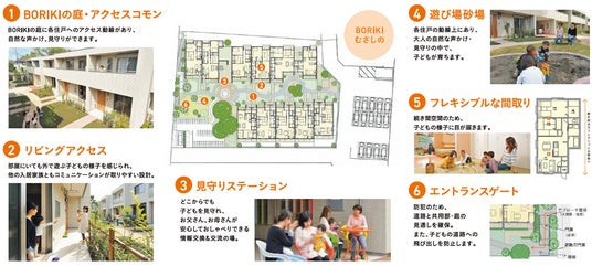 「ヘーベルメゾン BORIKI」では、入居者同士のゆるやかな繋がりをつくりだすために、共用部と各住戸における設計の工夫をしています。敷地内に中庭を設け、親が子どもを見守りながら情報交換できる見守りステーションと砂場を設置。各住戸はできる限り中庭に面する形で配置することで、自然な声かけや見守りができるよう工夫するなど、設計の工夫により入居者同士がお互いに子どもを見守り合う関係を育みます。