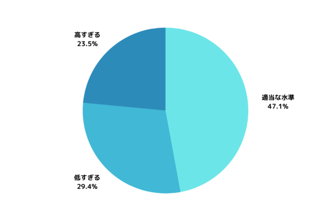最も多かった回答は「適当な水準(47.1%)」、以降「低すぎる(29.4%)」、「高すぎる(23.5%)」と続く結果になりました。