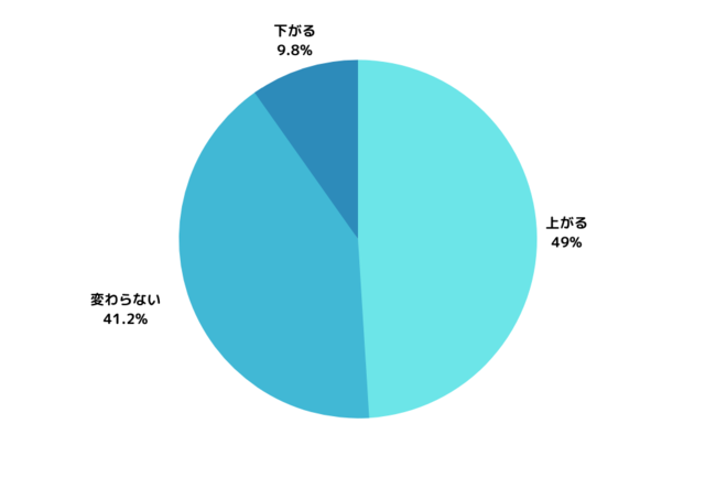 最も多かった回答が「上がる(49%)」、以降「変わらない(41.2%)」、「下がる(9.8%)」と続く結果になりました。