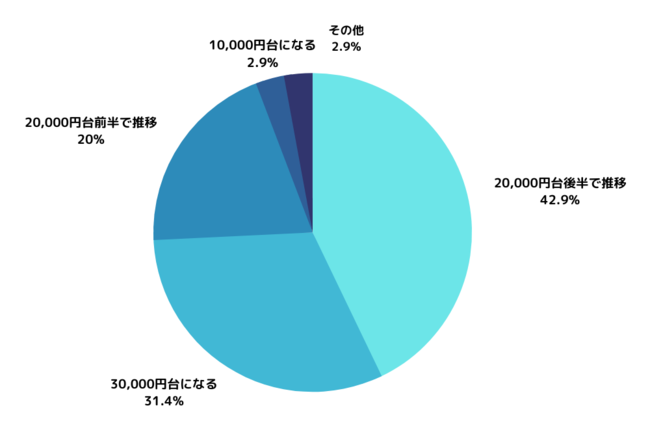 最も多かった回答は「20,000円台後半で推移(42.9%)」、以降「30,000円台になる(31.4%)」、「20,000円台前半で推移(20%)」、「10,000円台になる(2.9%)」、「その他(2.9%)」と続く結果になりました。
