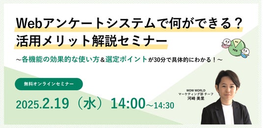 コミュニケーションシステム「WEBCAS(ウェブキャス)」とエンゲージメントソリューション「WOW engage(ワオエンゲージ)」を提供する株式会社WOW WORLD(ワオワールド/本社:東京都品川区、代表取締役社長:美濃 和男、以下、当社)は、Webアンケートシステムの活用メリットを解説する無料オンラインセミナーを、2025年2月19日(水)に開催いたします。本セミナーでは、当社のWebアンケート・フォーム作成システム「WEBCAS formulator」を用いながら、各機能の効果的な使い方やシステム選定ポイントなど、Webアンケートシステムの導入検討に役立つ情報を紹介いたします。