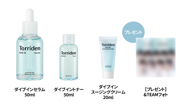 セット内容:ダイブインセラム50ml、ダイブイントナー50ml、ダイブインスージングクリーム20ml、&TEAMフォト