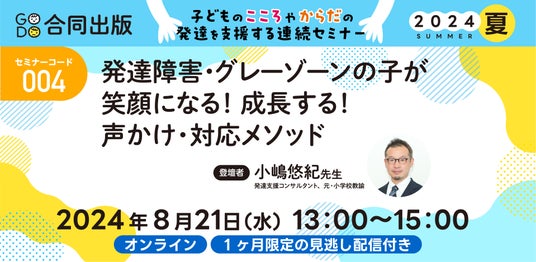 合同出版 子どものこころやからだの発達を支援する 連続セミナー2024夏 新学期に向けて子どもが輝く支援を伝授! 特別支援教育・療育・保育の現場で、すぐ役立つ知識や支援のポイントを、最前線で活躍する講師陣がお届けします。みなさまの参加をお待ちしております。