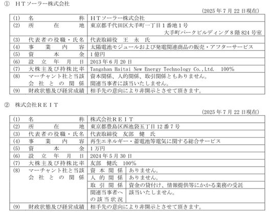 2025 年7 月22 日付でマーチャント社取締役会承認のうえ、同日、HTソーラー社、REIT社並びにマーチャント社の3 社で基本合意書を締結のうえ、2025 年7 月下旬、業務提携に基づく具体的案件に着手する予定であります。