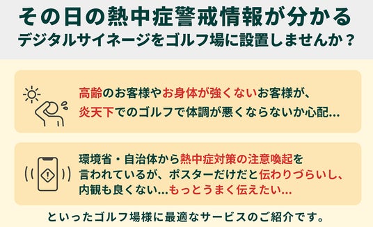 株式会社hunny(本社:東京都文京区、代表取締役:古澤伸一、以下「hunny」)は、ゴルフ場向けデジタルサイネージ広告サービス「xAdbox(アドボックス)」の専用プログラム「GOLF xAdbox(ゴルフアドボックス)」において、熱中症アラート機能を搭載した新サービスを開始し、現在、導入ゴルフ場様を募集しております。