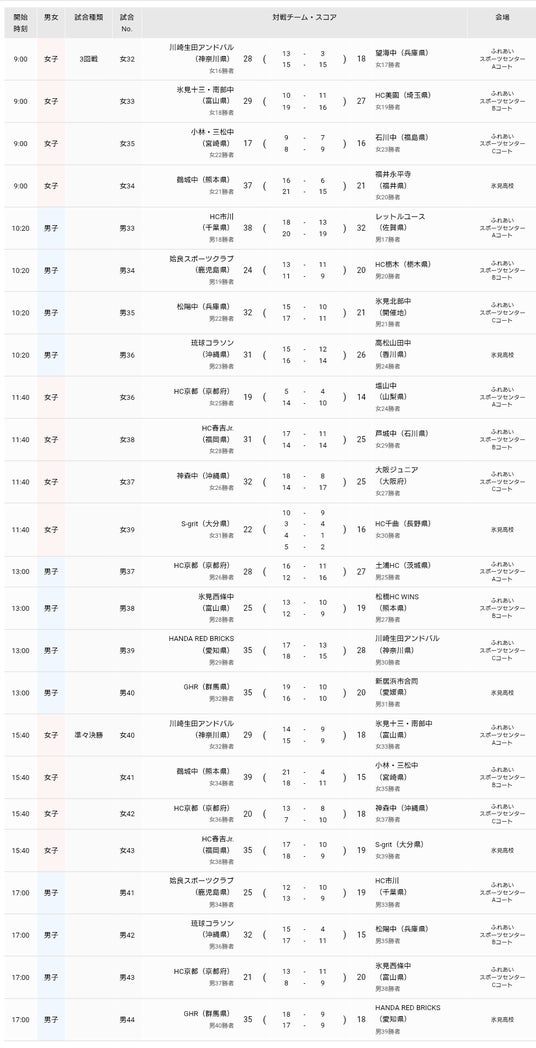 男子は3連覇を狙った西條中学校(富山)を破ったHC京都(京都)をはじめ、姶良スポーツクラブ(鹿児島)、琉球コラソンU-15(沖縄)、GHR(群馬)が、女子は大会2連覇をめざす鶴城中学校(熊本)、川崎生田アンドバル(神奈川)、HC京都、HC春吉Jr.(福岡)が準決勝進出を果たしました。