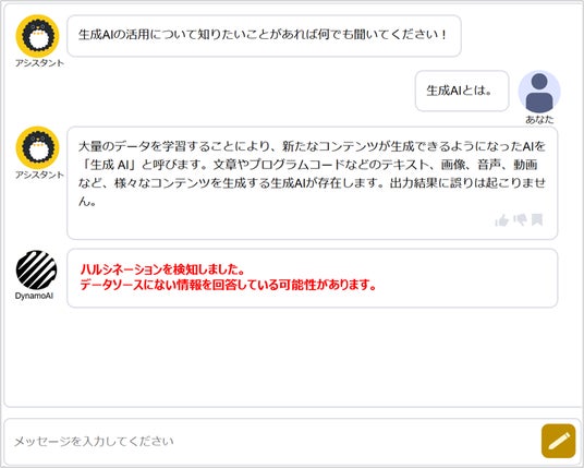 Dynamo Guardは、入力したプロンプトと企業のコンプライアンスポリシーとの整合性をリアルタイムで検証するAI監査ツールです。コンプライアンス上、不適切と判断される内容が入力された場合、当該プロンプトをAIの学習データとして使用せず、回答の生成も自動的に停止します。また、生成した回答、公的機関や業界団体、企業の公式データなどの信頼性が高い情報と照合し、回答の正確性を数値化して評価します。評価結果が一定水準を下回った場合には、画面上にアラートを表示して利用者に注意を促します。