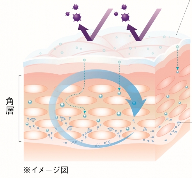 表面:板状の粉体「ベントナイト」が角層を包み込むように密着し、外部刺激・水分蒸発を防ぎ、バリア機能をサポート。うるおいをキープします。
