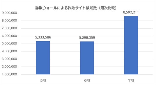 2024年7月の詐欺ウォールによる詐欺サイト検知数は8,592,211件で、2024年6月と比較すると、