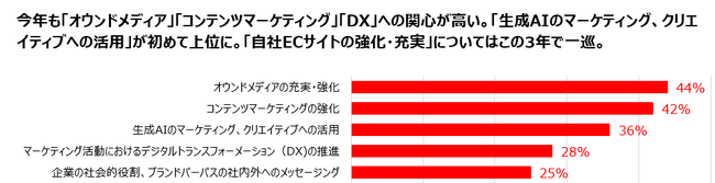 今年も「オウンドメディア」「コンテンツマーケティング」への関心が高く、「DX推進」「ブランドパーパス」など、企業全体で取り組む事項の関心も高い結果となりました。その中で「生成AIのマーケティング、クリエイティブへの活用」が初めて関心事項の上位となりました。2023年の3月ごろから、あらゆる場面で話題となった「生成AI」を本格的にどう活用していくのか、今年も注目を集めそうです。それ以外の回答項目については、詳細レポートにてご覧いただけます。