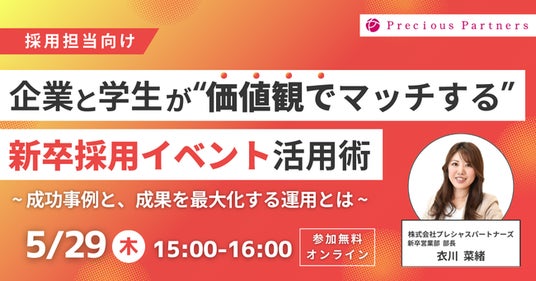 採用コンサルティング事業を行う株式会社プレシャスパートナーズ(本社:東京都新宿区、代表取締役社長 CEO:高崎 誠司)は、2025年5月29日(木)に『【採用担当向け】企業と学生が“価値観でマッチする”新卒採用イベント活用術~成功事例と、成果を最大化する運用とは~』をオンラインにて開催いたします。
