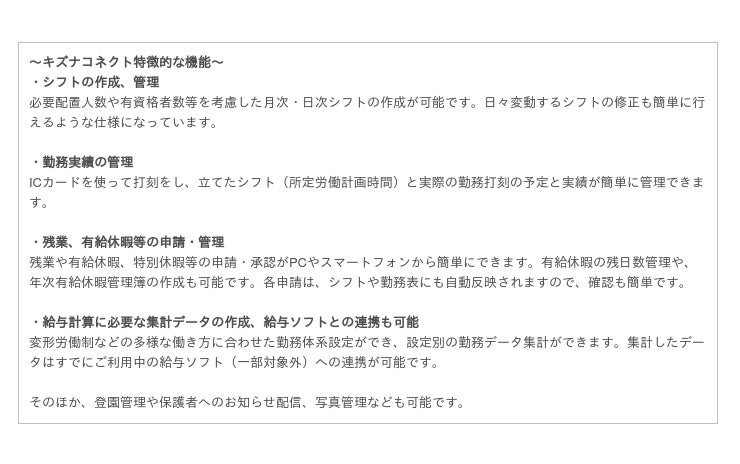 シンプル・便利さにこだわり、わかりやすい作りや操作の簡単さを追求。労務管理や保育料の計算など保育経営に重点を置いた機能や、写真やお知らせといった保護者向けの情報発信機能などを完備。業務の効率化とサービスの向上を実現します。