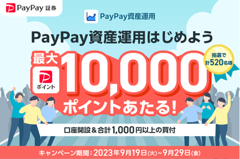 キャンペーン期間中に、「PayPay資産運用」から新規で口座申込および開設を完了し、期間中に合計1,000円以上購入した方の中から抽選で20名様に10,000ポイント、500名様に1,000ポイントのPayPayポイント(PayPayギフトカード)をプレゼントします。