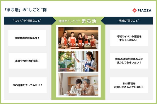 PIAZZA株式会社(代表取締役 CEO:矢野 晃平、以下 PIAZZA)は、地域住民の新たな活躍機会を創出し、街と人々の新たなつながりを生むことを目的として、住民が地域の“しごと”を有償で手伝う地域貢献プロジェクト「まち活」を開始いたします。PIAZZAが開発する地域コミュニティアプリ「ピアッザ」(以下、ピアッザ)を活用し、多様なスキルや経験をもつ地域住民が、企業・自治体等が抱える“困りごと”を解決する「新しい共助」によって、地域の人手・担い手不足の解消に寄与します。