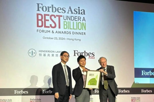 「Forbes Asia’s 200 Best Under A Billion」は、アジア太平洋地域における年間売上高が10億ドル未満の中堅・中小企業の中から、特に優れた業績を上げた上場企業200社を選出するものです。2024年10月23日に香港で開催された授賞式において、当社代表の千葉知裕が、フォーブス・メディア副会長であるクリストファー・フォーブス氏、ヘンダーソン・ランド・デベロップメント・カンパニー・リミテッド 、エグゼクティブ・ディレクターのオーガスティン・ウォン氏より証明書の授与を受けました。